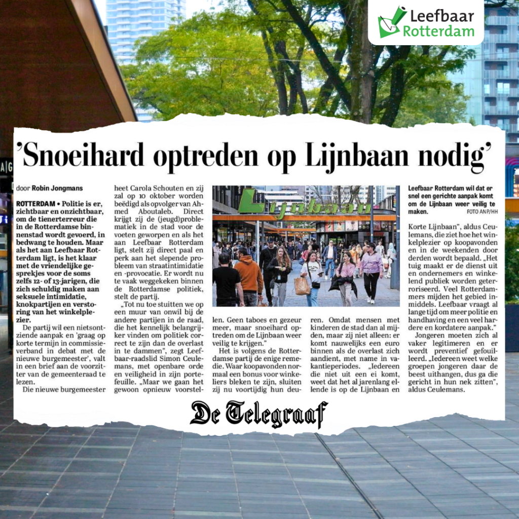 Leefbaar Rotterdam is de tienerterreur op de Lijnbaan en Korte Lijnbaan helemaal zat. Terwijl voor iedere Rotterdammer duidelijk is dat er hardere maatregelen nodig zijn om de overlast in te dammen, kijkt het merendeel van de Rotterdamse gemeenteraad nog altijd weg voor de problemen. Wij willen daarom op korte termijn met de nieuwe burgemeester Carola Schouten in debat over deze situatie, waarbij we opnieuw stevige voorstellen zullen doen om de wantoestanden effectief aan te pakken.
